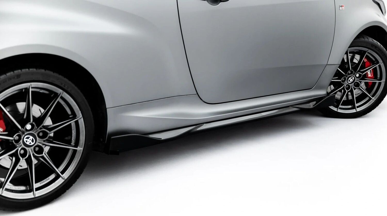 Les éléments livrés ici sont les inserts noirs plats (tout en bas des photos),à rapporter directement sur les bas de caisse d'origine de votre TOYOTA YARIS IV GR phase 2 depuis 2024 et ne montent pas sur YARIS IV Standard