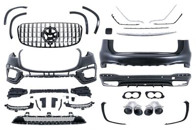 Le kit carrosserie complet diffusé par Oasis Tuning est composé d'un pare choc avant complet (avec calandre look Panamericana GTR chrome black et emplacements PDC),d'un pare choc arriere avec PDC,et un jeu d'embouts inox noirs look GLS(3 AMG (non gravés) ainsi qu'un set de 4 entourages d'ailes